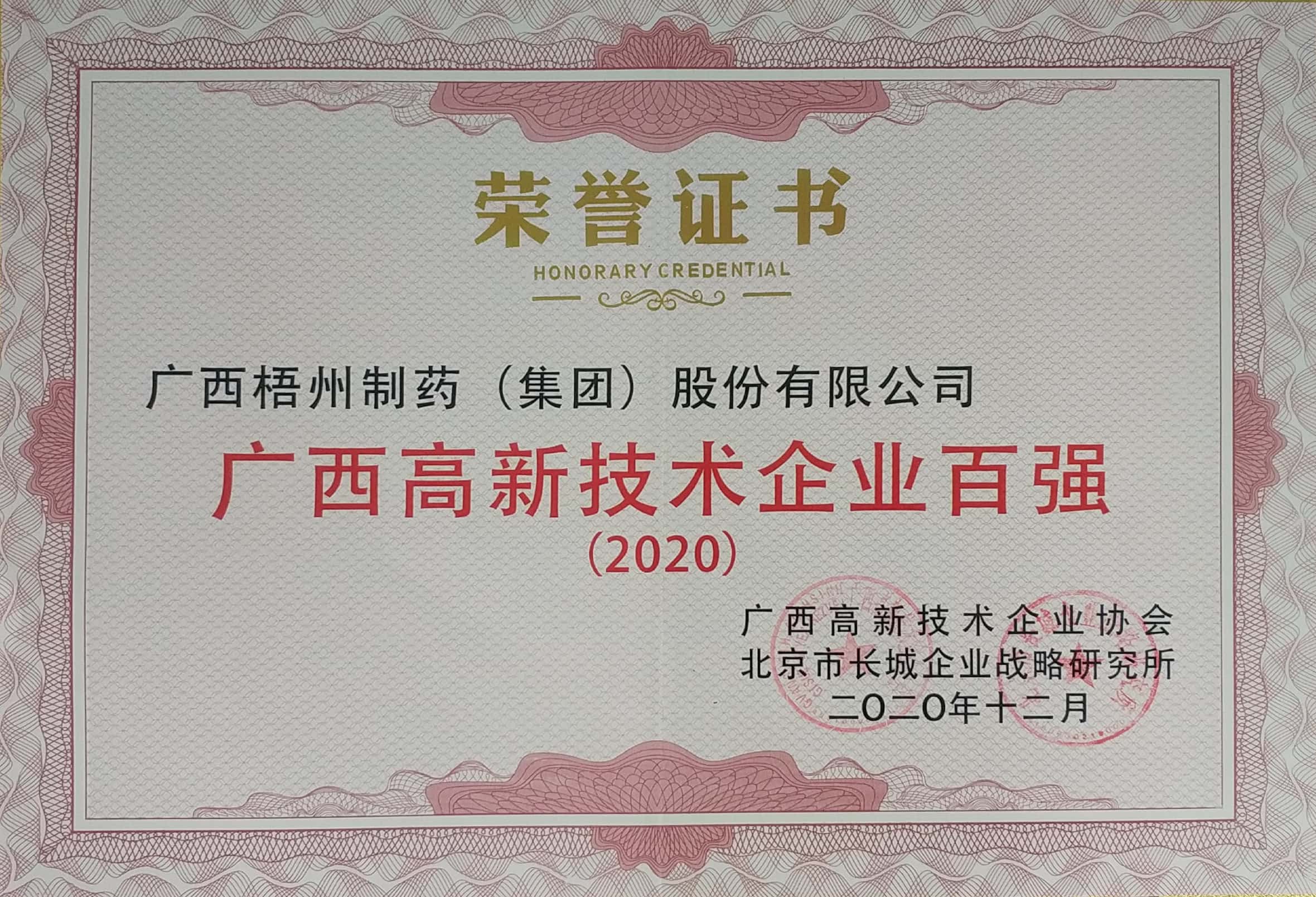 榮獲2020年廣西高新技術(shù)企業(yè)百強稱號