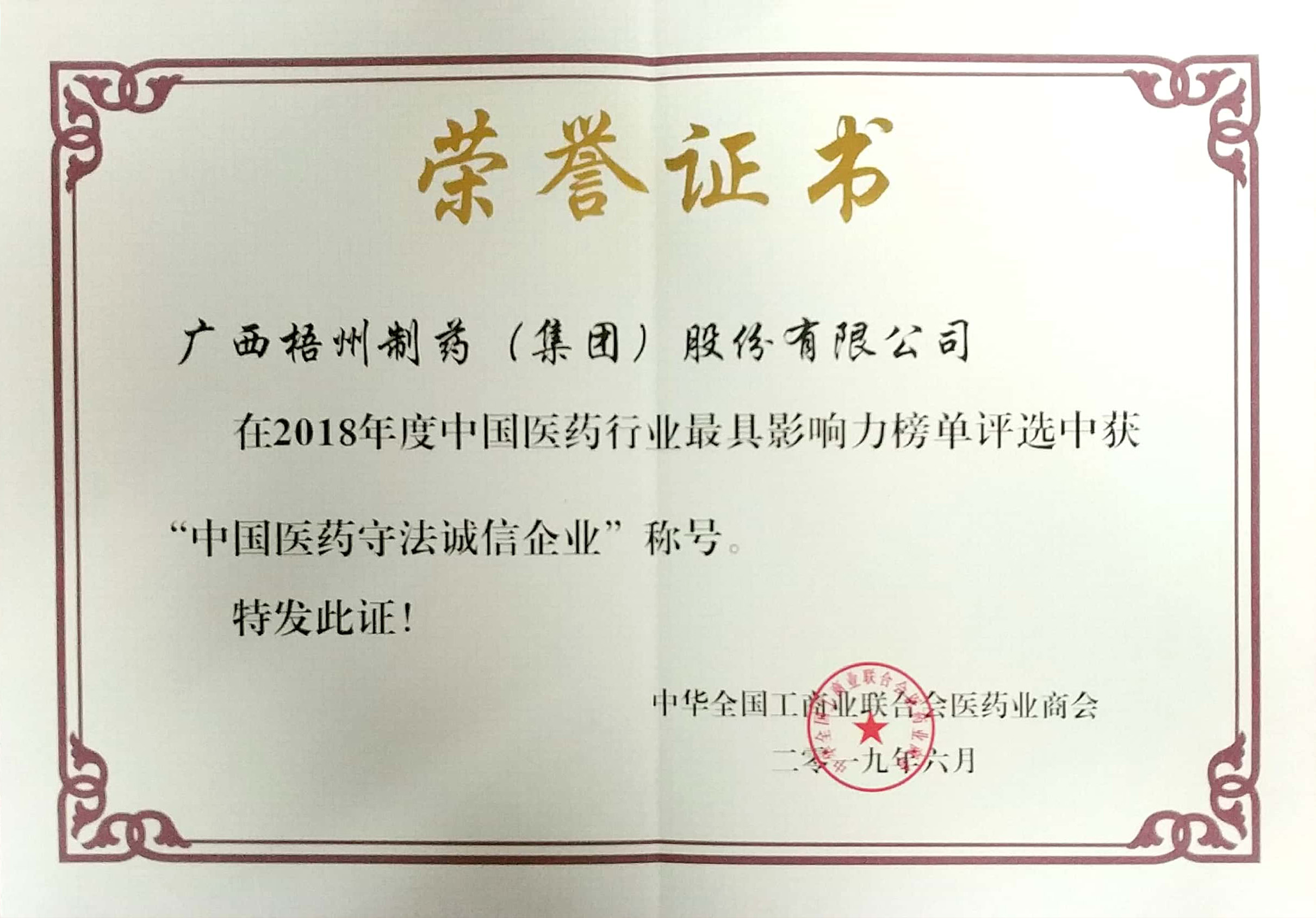在2018年度中國醫(yī)藥行業(yè)最具影響力榜單評選中獲“中國醫(yī)藥守法誠信企業(yè)”稱號。