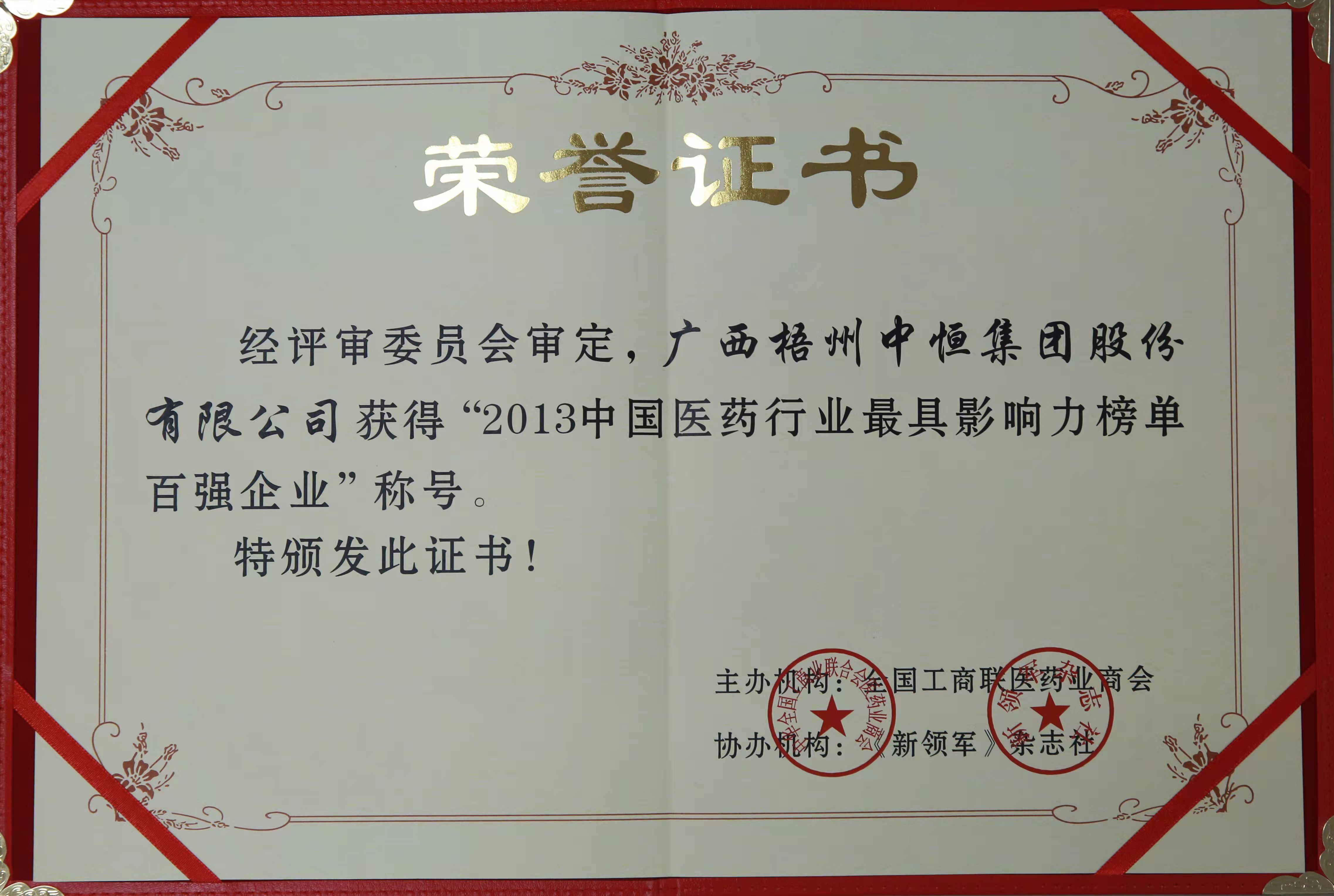 榮獲“2013年中國(guó)醫(yī)藥行業(yè)最具影響力百?gòu)?qiáng)企業(yè)”稱(chēng)號(hào)