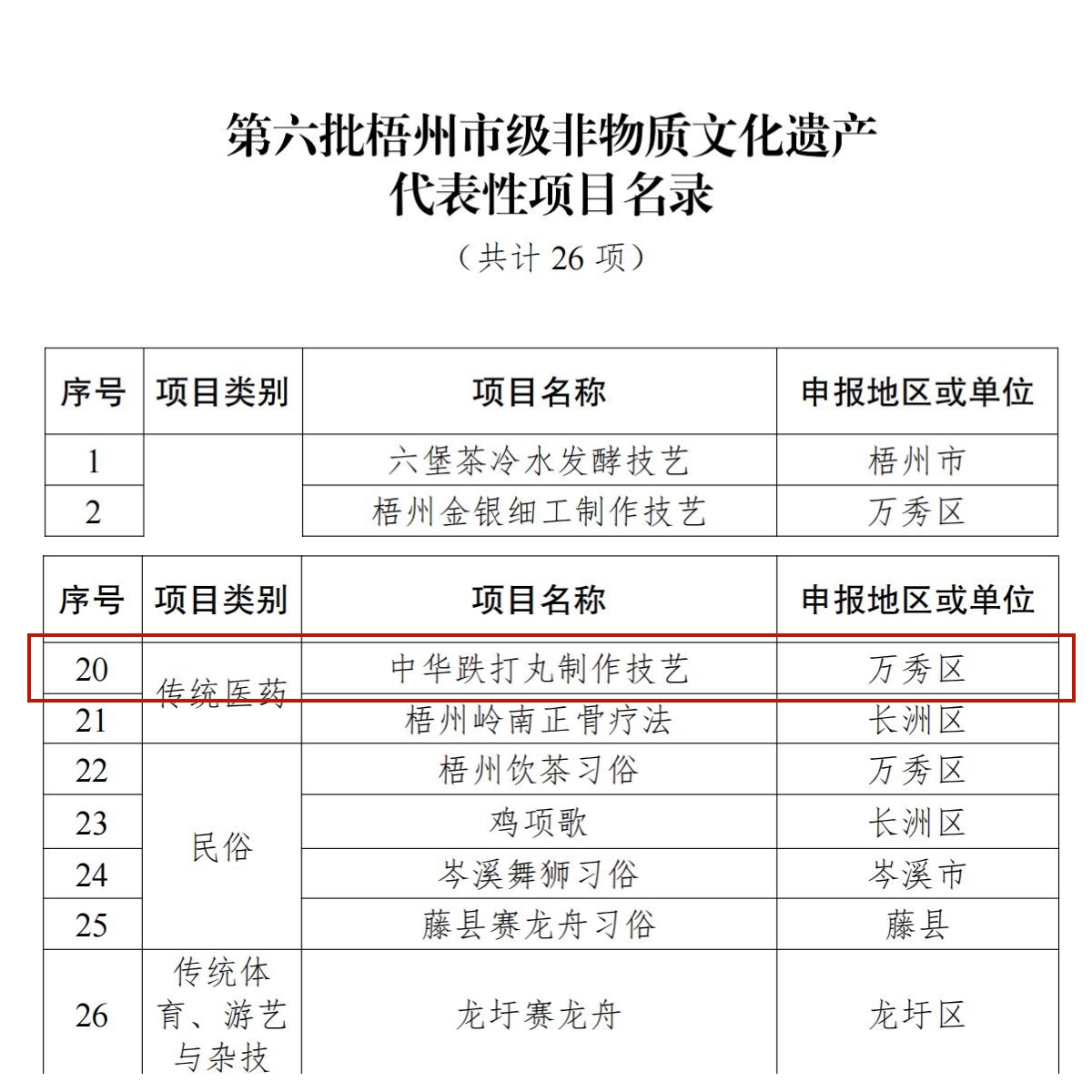 近日,在梧州市文化廣電體育和旅游局主辦的2023年“文化和自然遺產(chǎn)日”梧州市主會場宣傳展示活動中,梧州制藥中華跌打丸制作技藝獲授牌匾,成功入選梧州市第六批非物質(zhì)文化遺產(chǎn)代表性項目名錄。