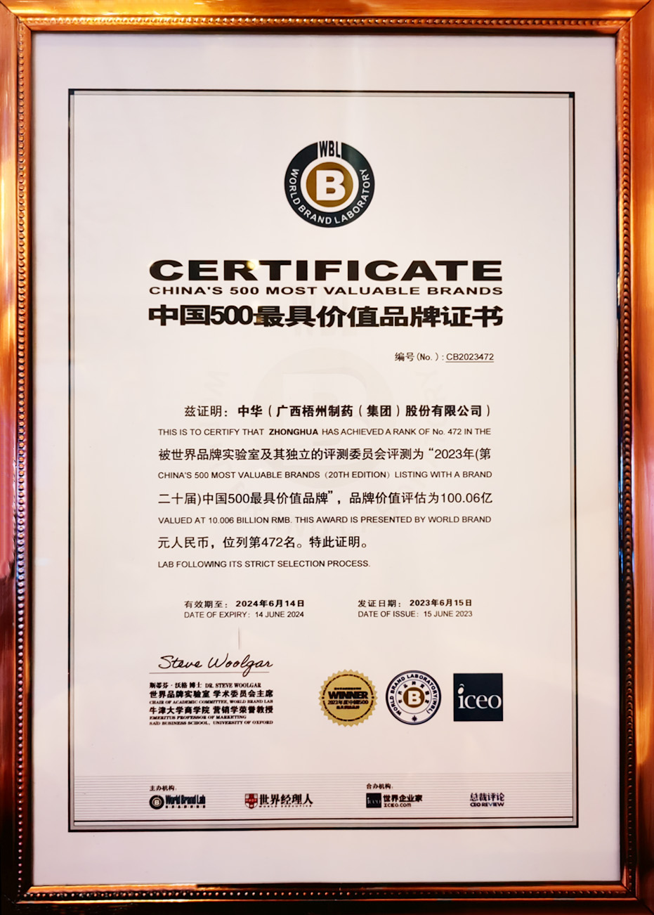近日,由世界品牌實(shí)驗(yàn)室(World Brand Lab)主辦的第二十屆世界品牌大會(huì)在北京舉行,大會(huì)發(fā)布了2023年《中國(guó)500最具價(jià)值品牌》分析報(bào)告,廣西共有9個(gè)品牌上榜,其中,梧州制藥的“中華”品牌位列其中,成為廣西唯一入選本次榜單的醫(yī)藥品牌。品牌價(jià)值評(píng)估為100.06億元人民幣,位列榜單472位。