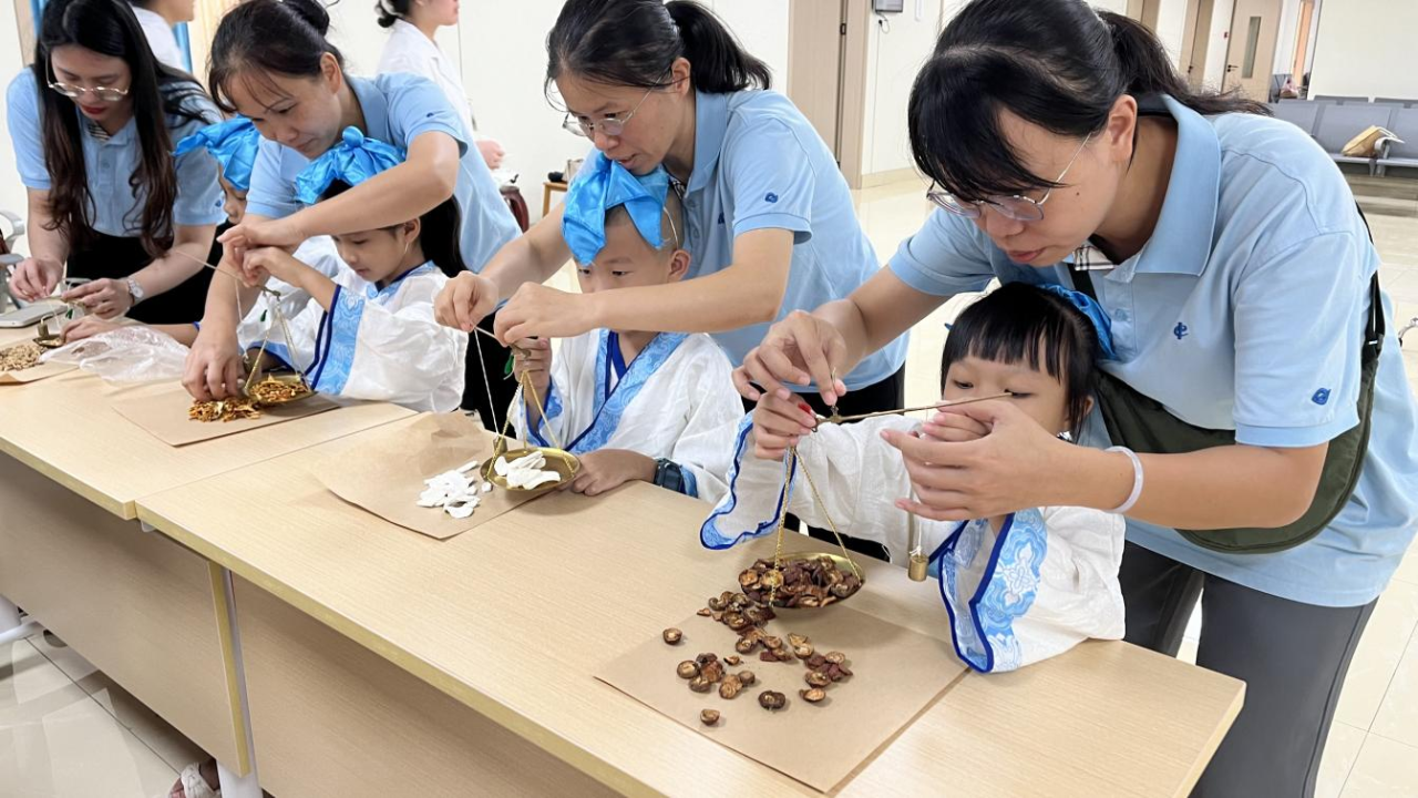 “黨參、黃芪、蜜棗...”氣味各異的中藥材一排排地擺放在桌上,孩子們好奇地湊近聞、伸長脖子仔細端詳。在現(xiàn)場中醫(yī)師的指導(dǎo)下,家長們手把手帶著孩子學(xué)習(xí)中藥材的稱量方法,“爸爸、媽媽,你看你看!我學(xué)會稱中藥了!”孩子們將戥稱高高舉起,自豪地向爸爸媽媽們展示。